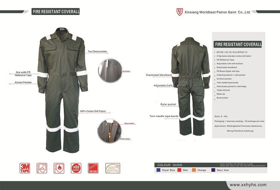 [Material and style] : Pure cotton flame retardant twill , after washing for 50 or 100 times, it still meet the national and international flame retardant standards. the cloth thickness is moderate, comfortable and breathable, with good heat dissipation, and suitable for high temperature climate environment. The front zipper, pocket with large capacity, movable fold on the back for easy movement, triple needle stitching with flame retardant, making bar tack in the stress point .